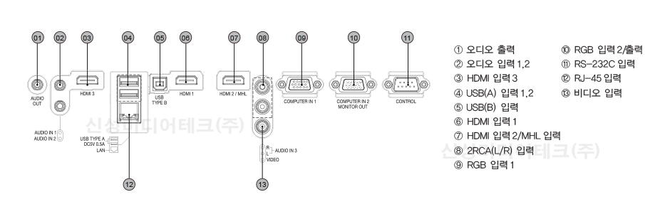 | 입력단자 | 3 X HDMI(MHL) 2 X 15pin D-sub(RGB) 1 X RCA(Composite) 1 X 2RCA(L/R) Audio 2 X Φ3.5 jack Audio | 출력단자 | 1 X 15pin D-sub(IN2 RGB) 1 X Φ3.5 jack Audio |