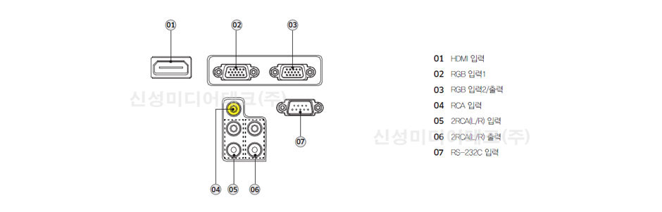| 입력단자 | 1 X HDMI 2 X 15pin D-sub(RGB) 1 X RCA(Composite) 1 X 2RCA(L/R) Audio | 출력단자 | 1 X 15pin D-sub(RGB IN2) 1 X 2RCA(L/R) Audio |