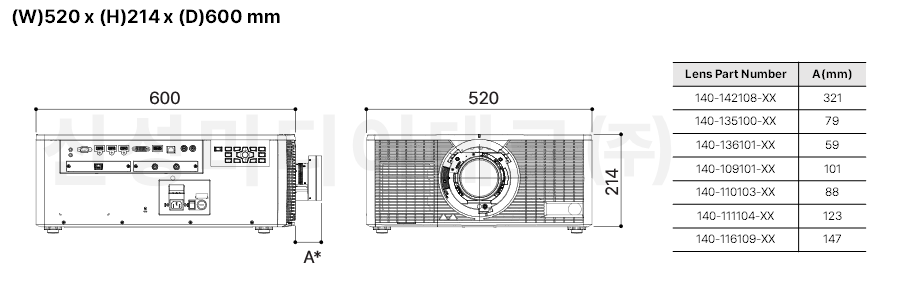 | 옵션 렌즈 | 6 종 | 렌즈 시프트 | 상하 ±140%, 좌우 ±60% *ILS 렌즈 기준 |