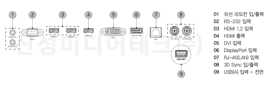| 컨트롤/서비스 단자 | 1 X RS-232C 1 X RJ-45 1 X USB(A) 2 X Φ3.5 jack Remote(I/O) | ||