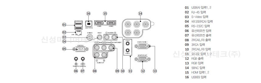 | 컨트롤/서비스 단자 | 1 X RS-232C 1 X RJ-45 2 X USB Type A 1 X USB Type B 2 X Φ 3.5 jack Remote( I/O) | ||